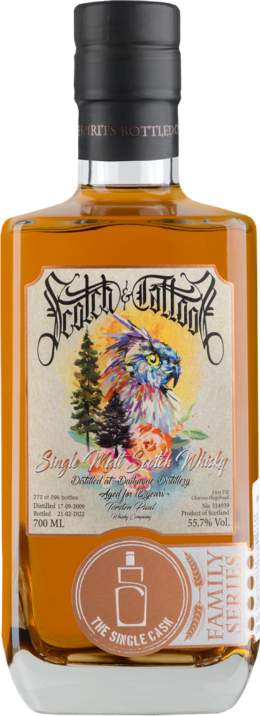 The Single Cask, "Scotch & Tattoos" Dailuaine Cask №314939, 12 Years Old — односолодовый виски, обладающий щедрым ароматом и насыщенным вкусом. Спирты были дистиллированы на винокурне Дейлуэйн 17 сентября 2009 года, а выдержка в течение 12 лет проходила в хогсхеде из-под хереса Олоросо №314939. Бутилирование при бочковой крепости 55,7% прошло 21 февраля 2022 года. Виски прекрасен в чистом виде в качестве дижестива, а также с добавлением воды, льда или в составе коктейлей. Всего было выпущено 296 бутылок виски, каждая бутылка пронумерована.