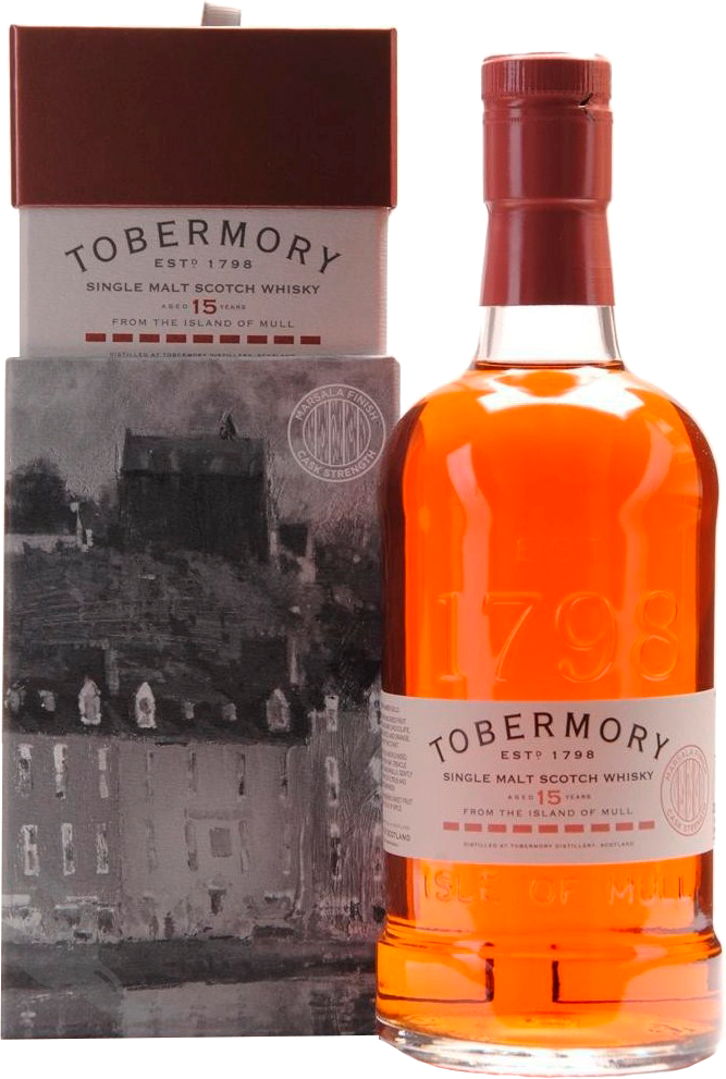 Tobermory, Aged 15 Years, Marsala Cask Finish — роскошный односолодовый виски 15-тилетней выдержки, демонстрирующий мягкий, округлый вкус и аромат. Спирты были выдержаны в дубвых бочках, а затем — в бочках из-под Марсалы. Всего было выпущено 1168 бутылок.
