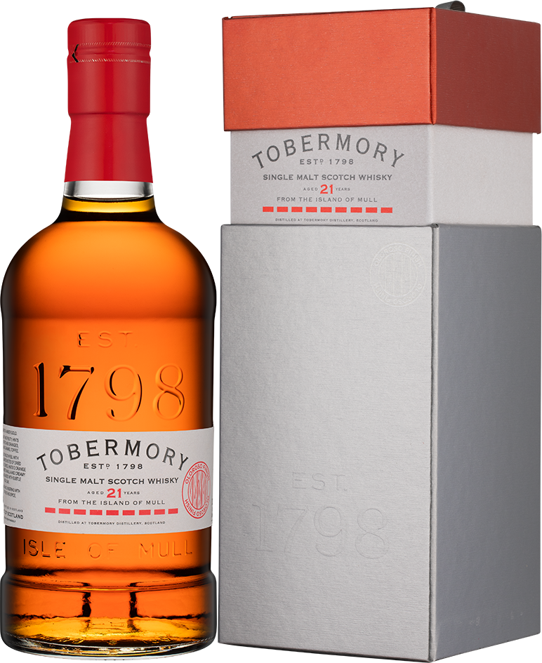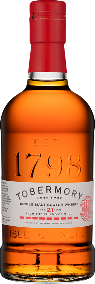Tobermory, Aged 21 Years — элегантный односолодовый виски, который производится методом двойной перегонки в медных кубах. Выдерживается виски в течение 18 лет в дубовых бочках повторного заполнения и 3 года в бочках из-под хереса Олоросо. Бутилирование виски без холодной фильтрации проходит при крепости 46,3%.