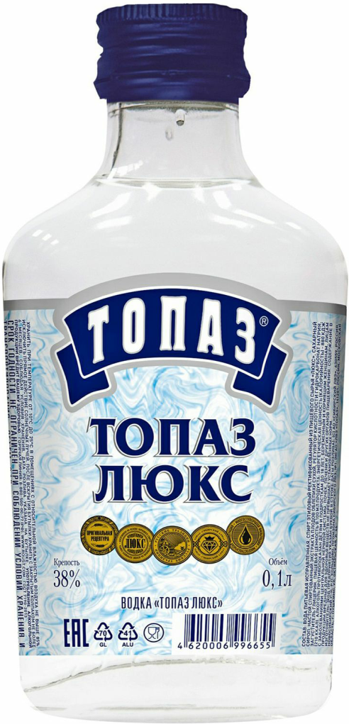 Топаз называют сибирским алмазом. Этому твердому полудрагоценному камню с ярким блеском приписывают лечебные и даже магические свойства. Водка с названием "Топаз" Люкс отличается чистотой и мягкостью вкуса. Ее создают на основе зернового спирта "Люкс", специально подготовленной, прошедшей молекулярную очистку родниковой воды и натурального экстракта ольховых листьев, благодаря которому практически исключается возможность появления похмелья. Изготавливается водка на одноименном заводе в г. Пушкино Московской области.