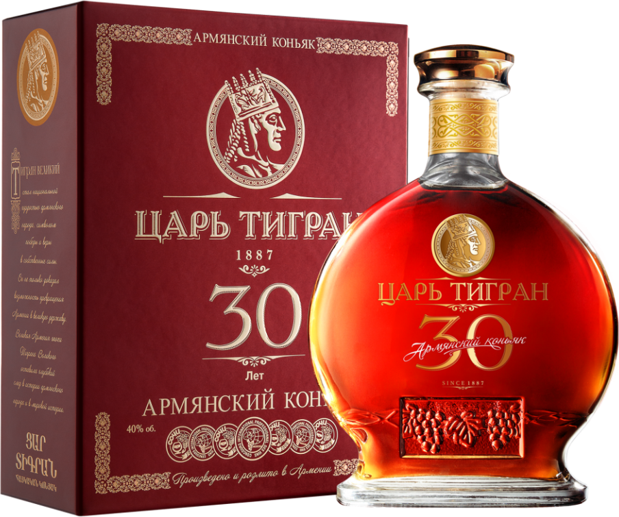 Коньяк "Царь Тигран" 30-летний изготовлен по классической технологии из отборного винограда, собранного в Араратской долине, по рецептуре заслуженного винодела Армении и России Роберта Азаряна. Средний возраст коньячных спиртов составляет не менее 30 лет.