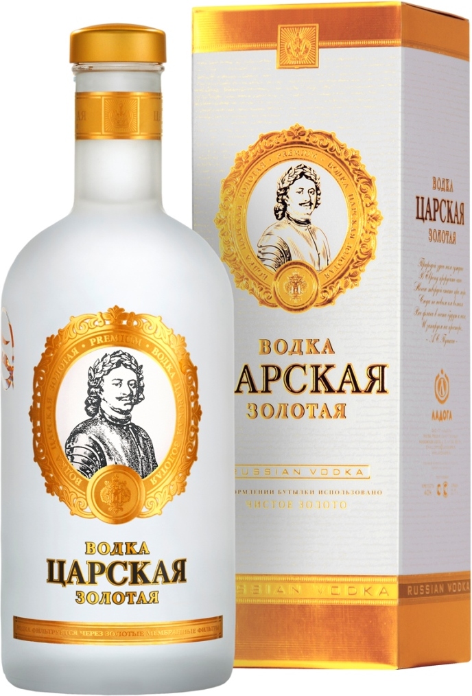 При производстве водки "Царская" применяется уникальная рецептура, воссозданная по архивам времен Петра Великого. Система очистки водки "Царская" Золотая включает 12 ступеней, а также дополнительно проходит через фильтры, прошитые золотыми нитями, за счет чего обогащается ионами 24-х каратного золота и обладает легким омолаживающим эффектом.