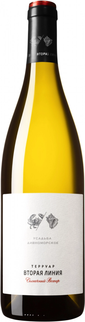 Усадьба Дивноморское, Терруар Вторая Линия, Солнечный Ветер — белое сухое вино с цветочным ароматом и ярким, освежающим вкусом, которое производится из винограда сортов Шардоне, Пино Блан и Манзони. Виноград культивируется на каменистых склонах, спускающихся к побережью Черного моря, в окружении реликтовых сосен. Такое происхождение виноградников символически отмечено на этикетках вин линейки изображением ракушки рапан. Уникальные геоклиматические условия позволяют ежегодно получать высококачественный урожай и исключительные вина из него, аналогов которым нет на российском рынке. Урожай собирается по достижении ягодами оптимальной спелости. Выдержка вина проходит на тонком дрожжевом осадке.