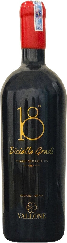 Впечатляющее, уникальное красное вино 18˚ Diciotto Gradi, Edizione Limitata от семейной компании Vallone из южной Италии покоряет роскошным вкусом и богатым, элегантным ароматом, в которых словно чувствуется теплое солнце полуострова Саленто. Это высококачественное 18-градусное вино, выпускаемое ограниченным тиражом, буквально взрывается в бокале фруктовыми и пряными ароматами, очаровывая с первого глотка. Обладая довольно высоким содержанием алкоголя "Дичиотто Гради" очень легко пьется, приятно опьяняя. Вино изготавливается из отборного винограда сорта Негроамаро, собранного со старых лоз виноградников компании в винодельческой зоне Саленто. Виноградные лозы культивируются в условиях мягкого микроклимата на известково-глинистых почвах, что создает благоприятные условия для созревания винограда.