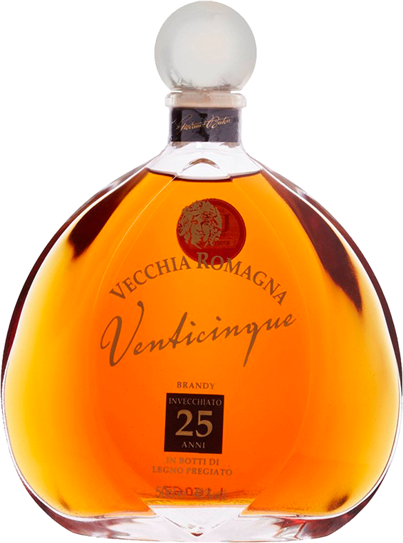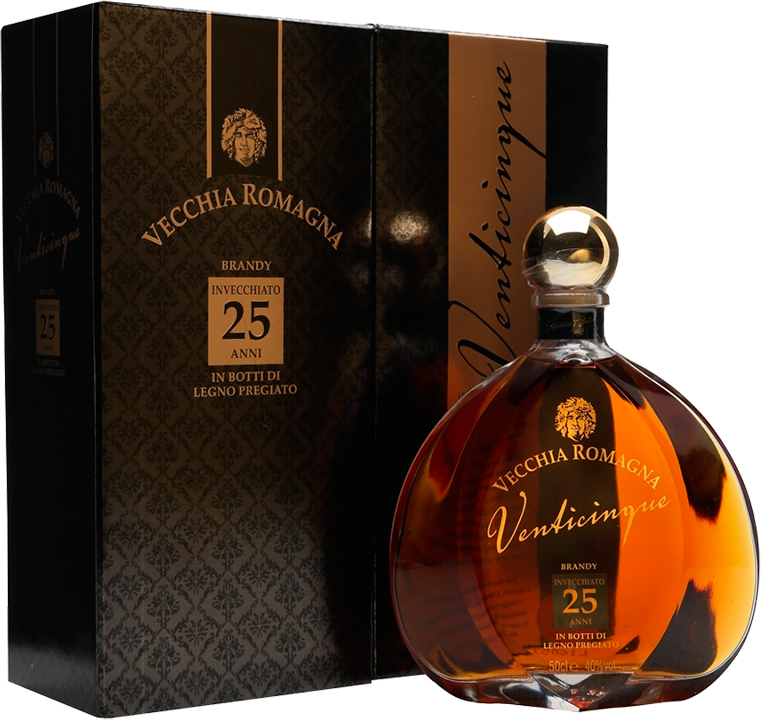 Vecchia Romagna, Venticinque — восхитительный бренди, который выдерживался в небольших дубовых бочках 25 лет. За эти годы бренди приобрел свой глубокий янтарный цвет и неповторимый вкус. 25-летний бренди предназначен для требовательных ценителей, знающих толк в роскошных выдержанных напитках.