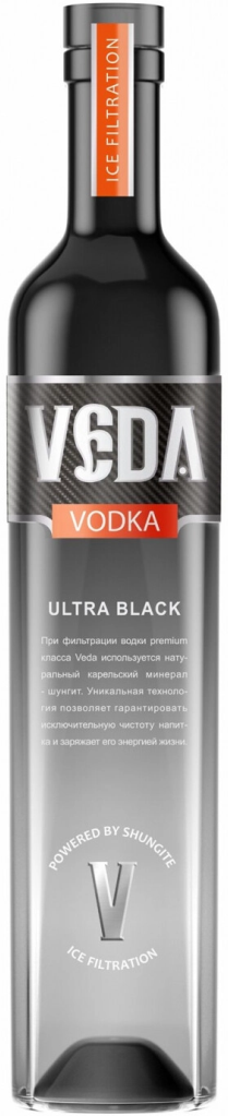 Veda, Ultra Black — классическая водка удивительной глубины. Она производится на основе спирта класса "Альфа" и артезианской воды из глубоких скважин, что придает готовому продукту кристальную чистоту и мягкость, с добавлением сахарного сиропа, спиртованных настоев овсяных хлопьев и кедровых орехов. Для изготовления спирта используют отборные зерна пшеницы, ржи и ячменя. Не только натуральные и высококачественные ингредиенты гарантируют высокое качество водки "Veda", но и уникальный запатентованный метод очистки — двойная ледяная фильтрация. Суть этого метода заключается в перемешивании спирта и предварительно очищенных натуральных ингредиентов в течение 26 часов с охлаждением до -5 °C. После чего полученный купаж фильтруют, что гарантирует яркость вкуса и его чистоту. Помимо двойной ледяной фильтрации "Veda" Ultra Black проходит фильтрацию шунгитом, натуральным карельским минералом.