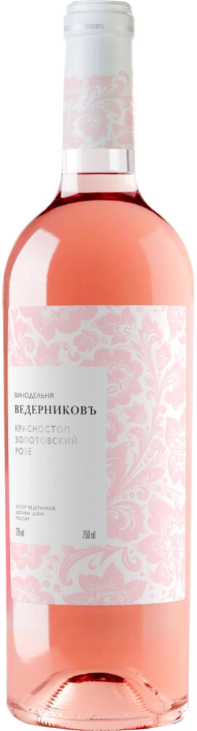 Розовое сухое вино Винодельня Ведерниковъ, Красностоп Золотовский изготовлено из винограда автохтонного донского сорта Красностоп Золотовский, являющегося гордостью винодельни. Ошеломляющее новаторство Винодельни Ведерниковъ — именно они решились первыми сделать из Красностопа розовое вино и не прогадали. Получилось обаятельное, приветливое и "смешливое" вино, которое приковывает к себе внимание даже скептиков.