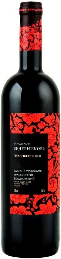 Красное сухое вино "Правобережное" от винодельни Ведерниковъ изготовлено из винограда сортов Каберне Совиньон и Красностоп Золотовский. Вино производят на модернизированных линиях, где используется гребнеотделитель, французская дробилка и криомацератор. Урожай собирают в ящики вместимостью 12-14 кг, после чего сортируют вручную. Виноград произрастает на участках со сниженной урожайностью — до 4 000 кг/га, что позволяет повысить концентрацию полезных веществ и обеспечивает оптимальное вызревание ягод. Вино "Правобережное" рекомендуют пить сейчас или в течение последующих трех лет.