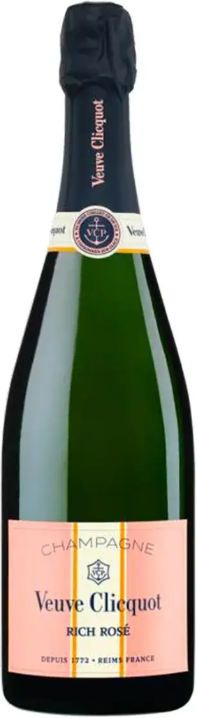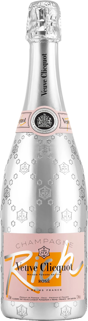 В шампанском Veuve Clicquot, "Rich" Rose оттенки красных фруктов и ягод повышаются до нового, захватывающего уровня. Это происходит в первую очередь благодаря высокой доле в купаже вина сортов группы Пино. Пино Нуар в сочетании с высоким содержанием сахара получает новые краски, значительная доля Пино Менье придает вкусу свежесть, яркую фруктовость и изысканность, а небольшая часть Шардоне наполняет его элегантностью. Во вторых, в купаж было добавлено около 12% резервных красных вин.