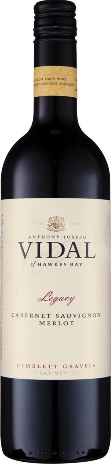 Vidal, Legacy, Cabernet Sauvignon-Merlot — изысканное красное сухое вино, изготовленное из винограда сортов Каберне Совиньон и Мерло, которые выращиваются на виноградниках компании в Хокс Бей. Жаркие летние дни, долгий вегетационный период и свободно дренируемые почвы помогли Хокс Бей стать одним из лучших винодельческих регионов в Новой Зеландии. Урожай собирается по достижении ягодами оптимальной спелости с виноградников "Омау Грэвелс" и "Те Ава". Средний возраст виноградных лоз составляет 18 лет. На винодельне ягоды тщательно сортируются и подвергаются 100% гребнеотделению. Ферментация протекает при контролируемой температуре 33 °С в открытых чанах в течение 27 дней с регуляным ручным пижажем. Вино выдерживается в течение 20 месяцев в барриках из французского дуба, 60% из которых — новые.