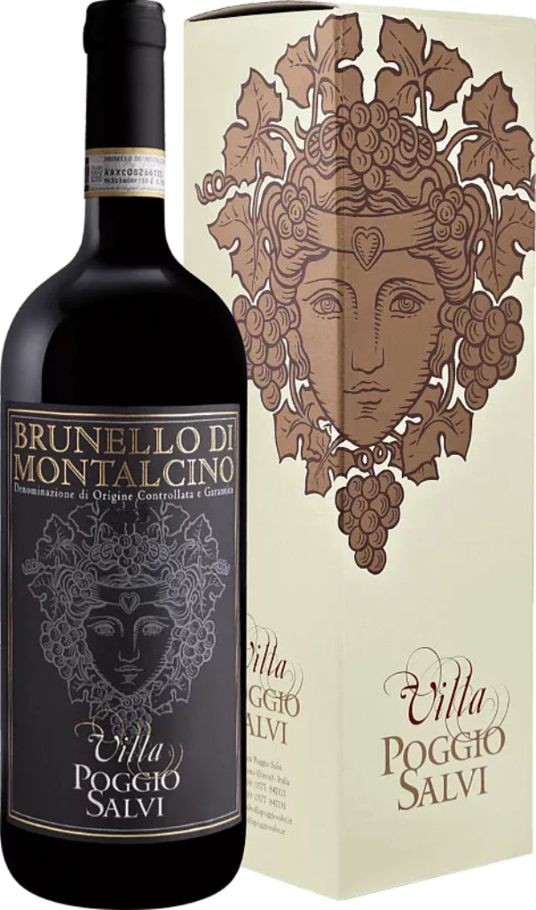 Villa Poggio Salvi, Brunello di Montalcino — элегантное красное сухое вино из винограда сорта Санджовезе Гроссо, выращенного в Монтальчино на высоте 350-500 метров над уровнем моря, на склонах с юго-западной экспозицией. Возраст лоз составляет от 15 до 35 лет. Урожай собирали вручную в конце сентября с большой осторожностью и заботой. Предварительная мацерация при температуре 12°С в течение 8 дней и 14-дневная ферментация при 28°С проводились в стальных резервуарах. Затем вино выдерживалось 30 месяцев в ботти из славонского дуба объемом в 30, 60 и 100 гектолитров. После бутилирования вино дозревало в погребах винодельни еще как минимум 4 месяца. Винтаж на пике зрелости будет находиться на протяжении 30 лет при правильном хранении, соблюдая влажность и температурный режим. Вино рекомендуется декантировать за час-два до употребления.