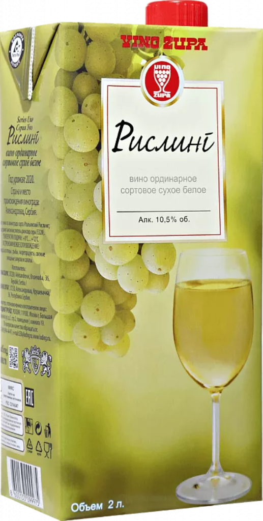 Vino Zupa, Riesling — столовое белое сухое сербское вино из винограда сорта Рислинг итальянский и других белых сортов, выращенных в Жупском регионе Сербии. Вино обладает гармоничным фруктово-цветочным ароматом и характерным вкусом с яркой кислинкой. Демократичная цена, высокое качество напитка и упаковка Тетра Пак делают его очень популярным. Вино подходит для повседневного употребления, пикников, загородного отдыха. Хорошо пьется в жару с парой кубиков льда.