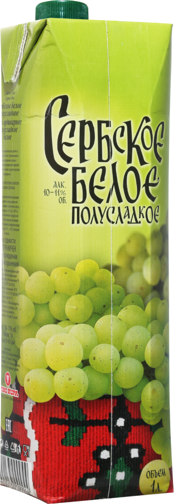 Сербское, Белое Полусладкое — столовое белое полусладкое сербское вино из винограда сортов Рислинг, Смедеревка и Жуплянка, выращенных в Жупском регионе Сербии. Вино обладает гармоничным фруктово-цветочным ароматом и приятным, сладковатым вкусом. Вино изготавливается по традиционному методу производства белых вин с принудительной остановкой брожения по достижении необходимого уровня остаточного сахара. Демократичное соотношение "цена-качество" и удобная упаковка Тетра Призма делают "Сербское" очень популярным напитком пикников и повседневного употребления.