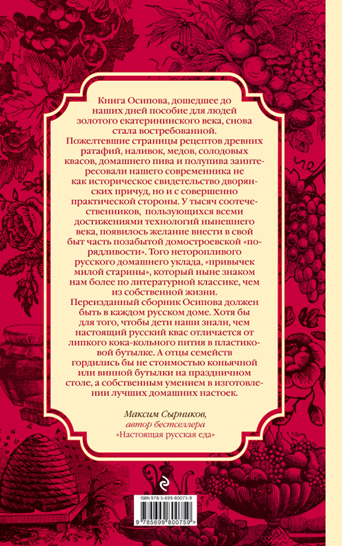 Перед вами новое издание книги, впервые опубликованной более 200 лет назад. Это одно из первых русских печатных руководств по приготовлению в домашних условиях разнообразных напитков: водки, вина, пива, кваса, сидра, меда, наливок, ликеров, морсов и т. д. В книге вы найдете рецепты алкогольных и безалкогольных напитков на любой вкус: и сохранивших популярность до наших дней, и старинных редких, и простых, которые можно сделать из всегда доступных продуктов, и необычных, требующих особого оборудования и экзотических ингредиентов. Также представлены рецепты различных видов уксуса, которые, несомненно, будут интересны тем, кто увлекается приготовлением продуктов по старинным технологиям.