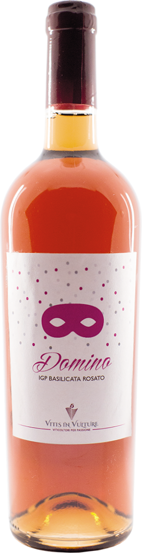 Domino, Rosato, Basilicata — итальянское розовое сухое вино, созданное из автохтонного сорта винограда Альянико дель Вультуре. Виноград выращивается на склонах вулкана Вультуре на высоте 450-700 метров над уровнем моря на плодородных вулканических почвах. Винификация и выдержка в течение 4 месяцев протекают при контролируемой температуре в емкостях из нержавеющей стали, затем вино выдерживается 2 месяца в бутылках. Вино гармонично сочетается с первыми блюдами из крабов, креветок или лангустов, с морской рыбой, приготовленной на гриле, с суши, со сливочными сырами.