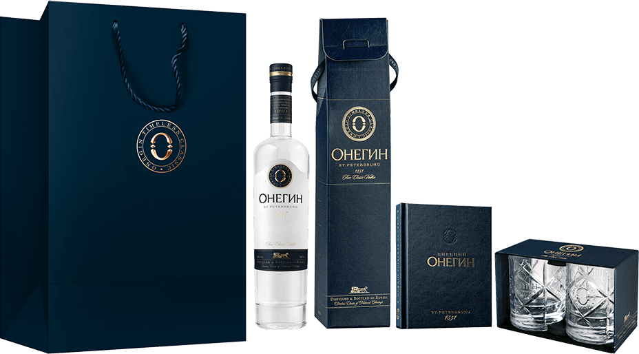 Подарочный набор включает одну бутылку водки "Онегин" объемом 500 мл в индивидуальном пакете, два фимемнных стакана Rocks и всемирно известный роман А. С. Пушкина, "Евгений Онегин". Такой презент по достоинству оценит настоящий ценитель классики и литературы.