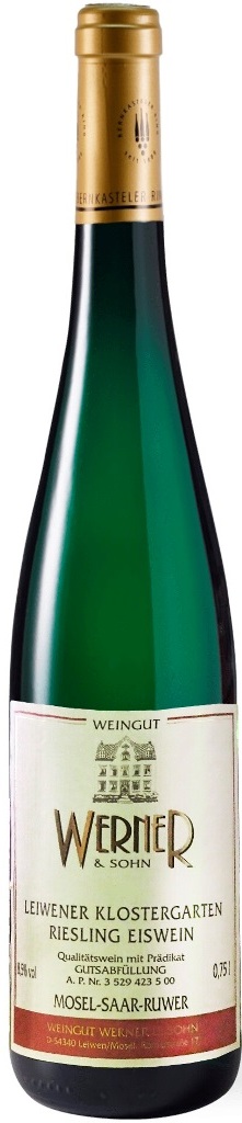 Weingut Werner & Sohn, Leiwener Klostergarten, Riesling Eiswein — коллекционное десертное вино с богатым, роскошным букетом, изготовленное из замороженного на лозе винограда сорта Рислинг, который выращивается на участке "Leiwener Klostergarten". Виноградник расположен на правом берегу Мозеля, вблизи деревни Лейвен. Структура его почв так же различна, как и крутизна склонов — некоторые из них плоские, некоторые слегка или умеренно крутые, с гравийными или сланцевыми почвами. Такой широкий спектр терруаров позволяет получать не менее многогранные вина. На винодельне виноград подвергается традиционной винификации при контролируемой температуре. Вино является отличным аперитивом, также рекомендуется подавать его к закускам, фруктам, десертам и изысканным сырам.