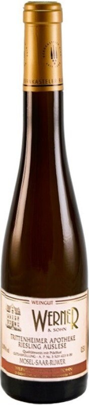 Weingut Werner & Sohn, Trittenheimer Apotheke, Riesling Auslese — мягкое, соблазнительное белое сладкое вино из винограда сорта Рислинг, который выращивается на винограднике "Trittenheimer Apotheke". Он имеет южную и юго-западную экспозицию. Из урожаев с участка "Триттенхаймер Апотеке" производятся великолепные вина, которые отличаются тонкой фруктовостью и игривой элегантностью. Это возможно благодаря преобладанию сланца, который частично перемежается с голубым девонским сланцем, в почвах виноградника. Здесь культивируют Рислинг для лучших Auslese, которые только может предложить Мозель. Auslese — очень ароматные и зрелые вина из полностью созревшего и самого здорового винограда позднего сбора. Название категории дословно переводится как "выборочный сбор". На винодельне виноград подвергается традиционной винификации при контролируемой температуре.