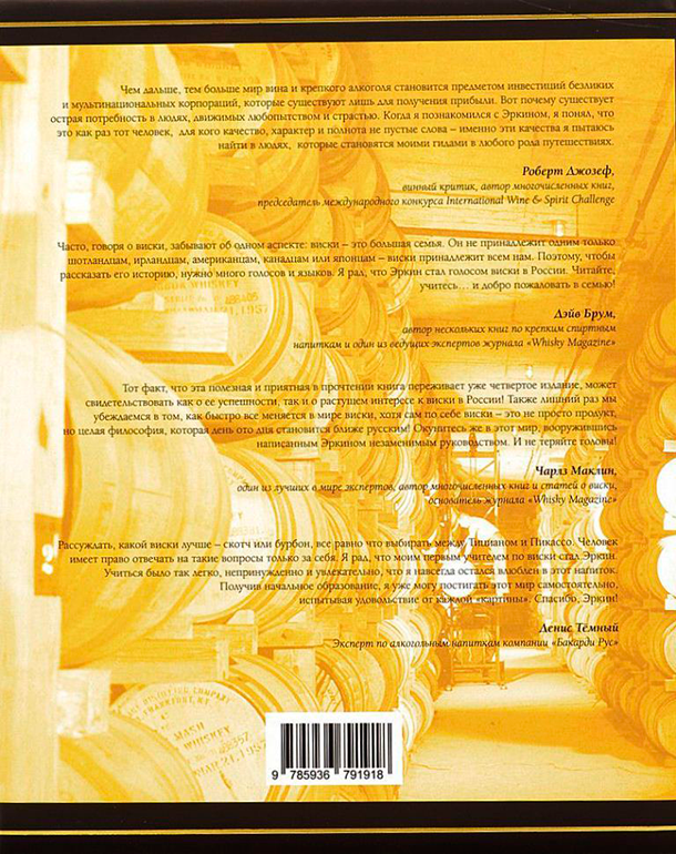 Эта книга — результат многолетних исследований автора, проведенных на заводах по производству виски в разных странах, итог его многочисленных дегустаций, поскольку Эркин Тузмухамедов — не только признанный теоретик, но и практик. На Международных конкурсах вин и спиртных напитков Vinnaya Karta Open его дистилляты завоевали четыре медали: две золотых, одну серебряную и одну бронзовую!