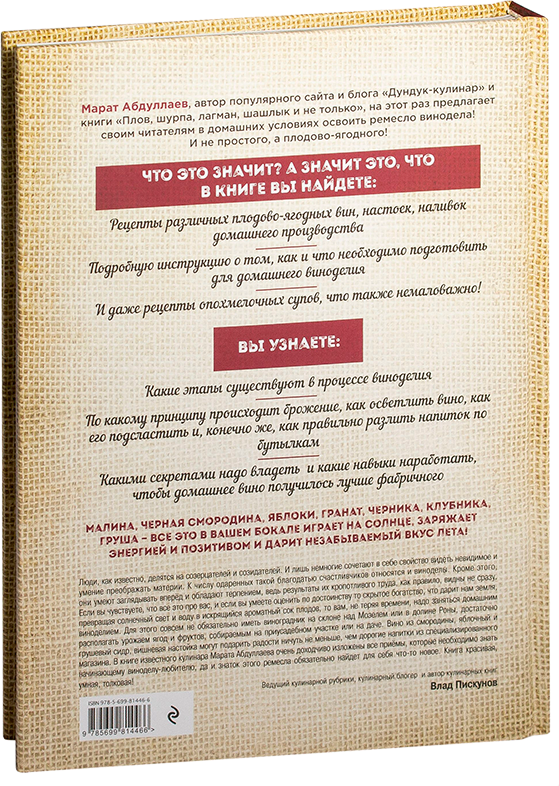 Марат Абдуллаев известный своим читателям по книгам о среднеазиатской кухне приготовил книгу о домашнем виноделии. Основу книги составляют рецепты плодово-ягодного вина. Книгу можно отнести к пошаговому руководству, где от самых азов до финала процесса автор досконально рассказывает все этапы домашнего виноделия. Эта книга будет полезна и тем, кто только приобщается к теме и тем, кто считает себя профи.
