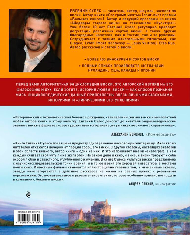Уникальная авторская энциклопедия по миру виски. Автор – признанный эксперт по виски как в России, так и за рубежом, сотрудничает с ведущими алкогольными гигантами. Писатель, актер, шоумен, автор рассказов и статей о виски (лонг-лист премии «Большая книга»). Полная авторитетная энциклопедия по миру виски сочетается с яркими личными рассказами и историями автора о виски. Книга включает подробное описание более 400 винокурен и сортов виски. Издание содержит полный список производств Шотландии, Ирландии, США, Канады и Японии. Роскошно иллюстрированная и насыщенная невероятными фактами энциклопедия об истории виски. Полноцветное издание на дорогой мелованной бумаге.