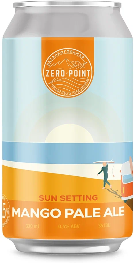Zero Point, "Sun Setting" Mango Pale Ale — уникальный безалкогольный нефильтрованный Пэйл Эль (крепость менее 0,5%), сваренный с добавлением натурального пюре манго и обладающий приятным ароматом с тонами манго и мягким вкусом с хорошим балансом между фруктовой сладостью, кислинкой и хмелевой горечью. В рецептуру эля входят солод двух сортов (Pale Ale, Wheat) и хмель трех сортов (Citra, Amarillo, Simcoe). "Говорят, чтобы путешествие прошло хорошо, важны две составляющие - внутренняя установка и внешняя обстановка. Сет и сеттинг. Этот манговый пэил эль с добавлением натурального пюре манго создан, чтобы передать атмосферу морского заката", — говорит производитель.