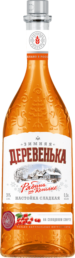 Зимняя деревенька, Рябина на коньяке — сладкая настойка, изготовленная на основе солодового спирта натурального брожения класса "Альфа" с добавлением концентрированного сока рябины и коньячного дистиллята, выдержанного не менее 3-х лет. Спирт для изготовления настойки производится на собственной солодовне компании из высококачественного зерна, выращенного на полях Мордовии. Все ингредиенты настойки натуральны и экологически чисты. Компания придерживается принципа: чем натуральнее, тем безопаснее и вкуснее. Настойку рекомендуется подавать в качестве аперитива, а также к ягодным пирогам и фруктовым десертам.