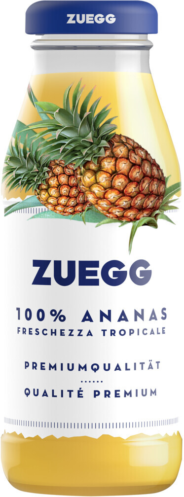 Zuegg, Ananas — натуральный ананасовый восстановленный сок без добавления сахара, изготовленный из фруктов, выращенных в Италии. Сок обладает приятным вкусом и ароматом с естественной сладостью, легкой фруктовой кислинкой и небольшим количеством мякоти. Сок превосходен охлажденным в чистом виде, хорошо сочетается с десертами, может использоваться в коктейлях.