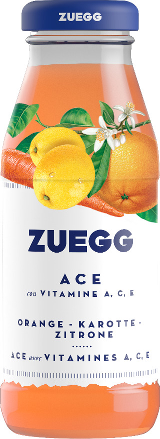 Zuegg, Vitamine A,C,E — сокосодержащий напиток без глютена, с содержанием витаминов А, С и Е (L-аскорбиновая кислота, DL-альфа-токоферилацетат, бета-каротин), в состав которого входит сок апельсина (21%), морковный сок (5%) и лимонный сок (4%). Нектар обладает насыщенными вкусом и ароматом с фруктово-овощными тонами, мягкой сладостью и приятной кислинкой. Нектар превосходен охлажденным в чистом виде, хорошо сочетается с десертами, может использоваться в коктейлях.